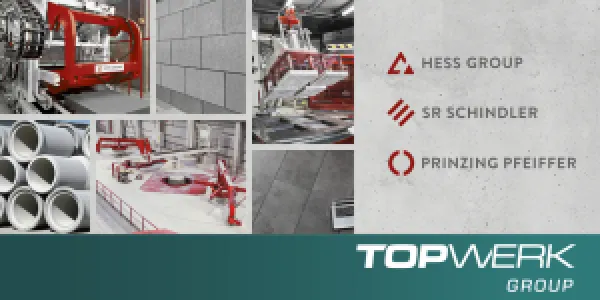 The TOPWERK Group is the world's leading supplier of machines and plants for industrially manufactured concrete products. The holding company unites the renowned brands HESS GROUP, SR SCHINDLER and PRINZING PFEIFFER under one strategic roof. Numerous sales and service locations all over the world guarantee proximity to customers. The portfolio includes machines and plants from producing concrete and hermetic slabs to dosing and mixing plants, packaging and conveying technologies, finishing plants and the manufacture of pipes and manholes.