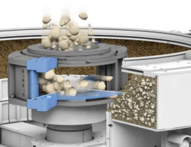 Every single particle of the input material undergoes extreme acceleration due to the centrifugal force in the rotor and is hurled against the impact wall. The impact wall can either consist of an anvil ring or alternatively of a material bed. Clogging is avoided due to the generous dimensioning of the rotor and housing. The crushing results can be substantially controlled and optimized by selecting a suitable speed.